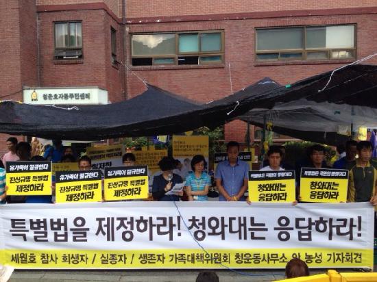 국민들에게도 호소 드립니다. 심리상담·치유 등에 종사하는 심리학자 373인이 “세월호 참사로 인한 비극과 아픔을 치유하기 위해서 선결되어야 할 것은 명명백백한 진상규명이다”라며 “수사권과 기소권이 포함된 특별법을 제정하라”고 촉구했습니다. 생존학생 학부모들도 생존학생들을 치유하는 길은 진상규명이라고 호소했습니다. 그렇습니다. 우리에게 지금 필요한 것은 “우리 가족들이 왜 그곳에서 죽어야 했는지 이유를 아는 것”입니다. 우리 눈앞에서 죽어간 자식들의 원한을 안고 살아갈 수는 없습니다. 여기 청운동 앞으로 교복 입은 학생들이 지나갈 때마다 울컥 눈물이 납니다. 우리를 지지하기 위해 찾아온 6개월 아기를 보고도 울었습니다. 우리에게 지금 시간은 그렇습니다. 금세라도 초인종을 누를 것 같은 아이들을 잃었습니다. 우리는 손에 닿을 듯한 살아있던 피부와 따뜻한 체온을 빼앗겼습니다.