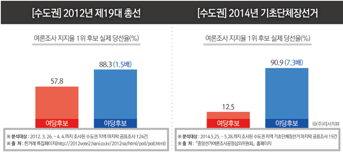 지난 2014년 지방선거 직전인 5월 25일부터 28일까지 조사된 수도권 기초단체장선거 관련 19건의 공표조사에서도 1위를 기록했던 새누리당 후보가 당선된 비율은 12.5%에 불과한 반면, 야권후보 당선율은 90.9%로 무려 7.3배나 더 높았다.