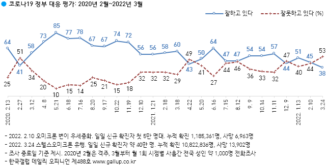 [한국갤럽] 38%만 "정부, 코로나대응 잘해", 역대최저