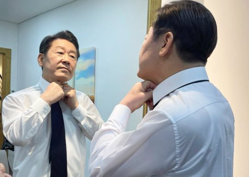 사진속 이 전 후보는 머리 손실과 함께 흰머리를 검게 염색한 뒤, 거울을 보며 와이셔츠의 단추를 꿰고 있었다. 이밖에 헤어디자이너와 웃으며 찍은 사진도 올렸다.