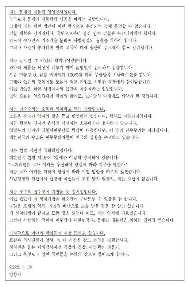 양 의원은 문건에서 “저는 문재인 대통령 영입 인사다. 누구보다 문 대통령의 성공을 바라는 사람”이라며 “그래서 저는 이번 (검수완박) 법안이 이런 방식으로 추진되는 것에 동의할 수 없다. 사안이 중차대한 만큼 오류에 대해 충분히 검토돼야 함도 당위”라고 밝혔다.