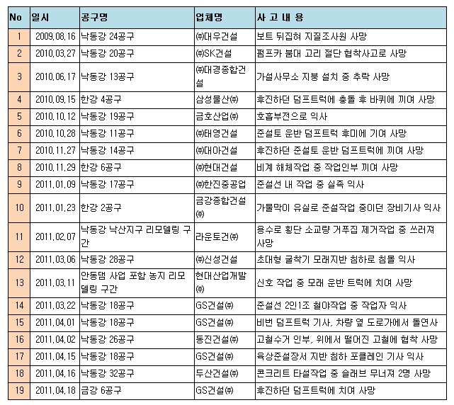 이들은 이명박 대통령에 대해서도 "이 대통령은 '4대강을 가지고 이러쿵저러쿵 하시는 분도 많지만 아마 금년 가을 완공된 모습을 보게 되면 아마 모두가 수긍할 것'이라고 발언, 사망사고에도 불구하고 4대강사업의 속도전 강행할 뜻을 내비췄다"며 "이처럼 4대강사업에서 발생하는 문제에 대해서는 침묵하며 4대강사업에 대한 자화자찬으로 일관하며 사업을 강행한다면 이명박 정권은 ‘토건독재 정권’이라는 역사적 평가를 피할 수 없을 것"이라며 잇단 사망사고에 대한 이 대통령의 공개사과를 촉구했다. 4대강 공사 중 사망사고 일지. ⓒ경실련