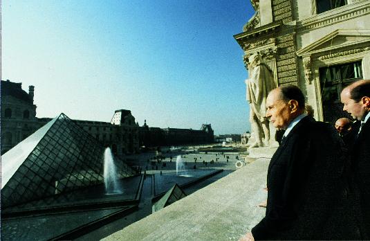 1993년 새로 개관한 피라미드 형태의 루브르 박물관을 돌아보고 있는 미테랑 대통령. ⓒ연합뉴스