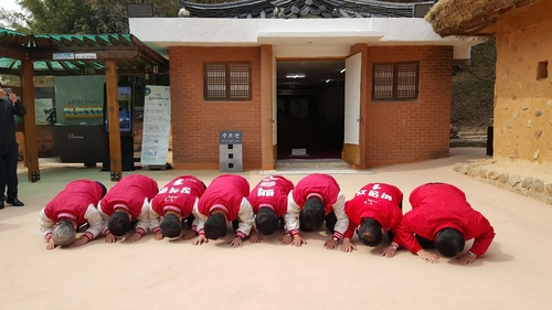 최 의원은 “'미워도 다시 한번'이라는 노래도 있지 않느냐”며 “회초리 많이 때려주시고 이번 총선 제대로 돼 박근혜 정부가 제대로 될 수 있도록 해달라. 다시는 박 대통령을 잘못 모신다든지, 대구 민생을 외면하다든지 우리끼리 싸우지 않겠다”고 말했다. 최경환 의원 등 새누리당 경북선대위 '큰 일꾼 유세단'이 6일 구미시 상모동 박정희 전 대통령 생가를 찾아 도민들에게 사과의 큰 절을 올리고 있다. ⓒ연합뉴스