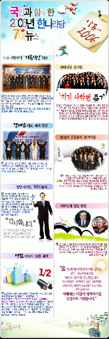 앞서 한나라당은 지난 22일 올해의 한나라당 7대 뉴스를 발표하면서 ▲5.31 지방선거 압승 ▲강재섭 대표 체제 출범 ▲원내정당 신기원 ▲참정치 운동본부 본격시동 ▲정당지지도 50% 돌파 ▲외부인재 영입 활발 ▲반값 아파트 당론 채택 등을 선정했다.