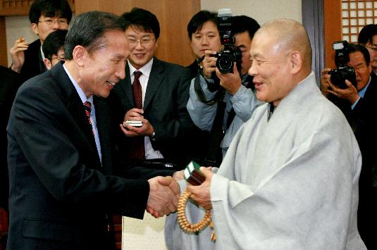 이명박 전 서울시장이 8일 조계사를 방문, 지관 총무원장과 악수하고 있다. 이후 출생지를 묻는 <오마이뉴스>와 이 전시장이 격돌했다. ⓒ연합뉴스