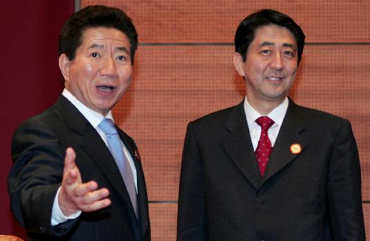노무현 대통령과 아베 신조 총리가 18일 베트남 하노이 국제회의센터에서 열린 한.일 정상회담에서 인사하고 있다. 노 대통령은 이날 아베 총리에게 동해를 '평화의 바다'로 바꾸자고 제안했다가 일축당한 것으로 알려지고 있다. ⓒ연합뉴스