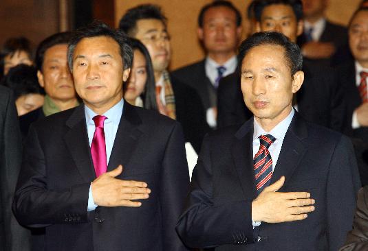 일 서울 세종문화회관 세종홀에서 열린 민주동지회 신년회에 참석한 손학규(왼쪽) 전 경기지사와 이명박 전 서울시장이 국민의례를 하고 있다. ⓒ연합뉴스