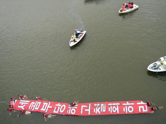 지난 11월 28일, 삼성에스원연대 노동자들은 삼성에스원의 부당해고에 항의하며 한강을 건넜다.ⓒ최병성 기자