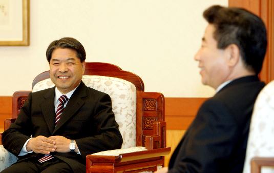 유신지지 서명 논란에 휩싸인 이재정 통일장관이 노무현 대통령과 환담하고 있다. ⓒ연합뉴스