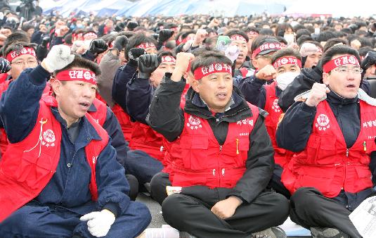 17일 현대자동차 울산공장 본관앞에서 열린 노조의 파업 집회에서 노조원들이 구호를 외치고 있다. ⓒ연합뉴스