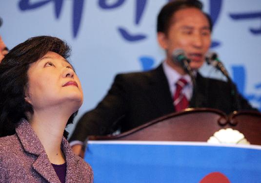 17일 오전 충남 천안에서 열린 한나라당 충남도당 신년교례회에서 박근혜 전 대표가 이명박 전 서울시장의 연설도중 냉랭한 표정으로 천정을 쳐다보고 있다. ⓒ연합뉴스