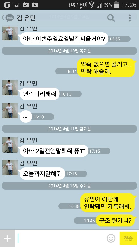 김씨는 사고 당일인 4월 16일 오전 10시 48분에 사고 소식을 듣고 "유민아 아빤데 연락되면 카톡해 봐." "구조된 거니?"라는 다급한 메시지를 보냈지만 답은 없었다.