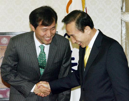 10일 오후 오세훈 변호사는 서울시로 이명박 시장을 예방했다. 서울시장 후보 출마신고식이었다. 보도진들이 가득찬 접견실에서 오 변호사는 이 시장과 정말 반갑게 팔을 크게 흔들며 악수를 나눠 주변을 놀라게 했다.