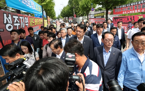 26일 오전 경북 성주군 성주군청을 찾은 정진석 원내대표 등 새누리당 지도부들이 성주군민들의 항의를 받으며 군청으로 들어가고 있다. ⓒ연합뉴스