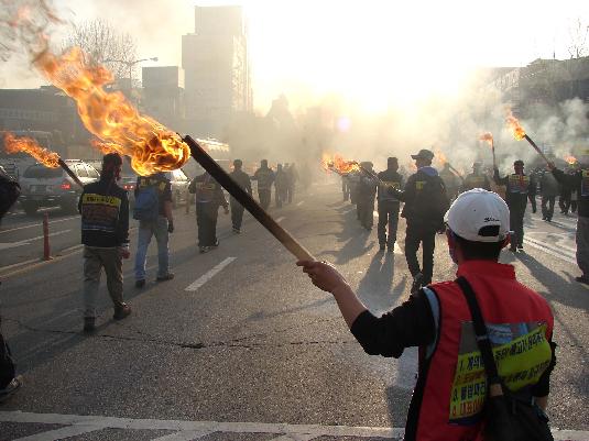 대학로에서 종각으로 이어진 가두시위에서 노동자, 농민 대오 500여명이 횃불을 들고 행진하고 있다.ⓒ최병성