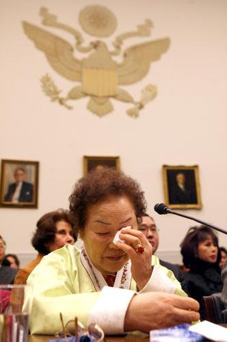 미 하원에서 일본군의 만행을 눈물을 흘리며 폭로하고 있는 한국의 종군위안부 할머니들. ⓒ연합뉴스