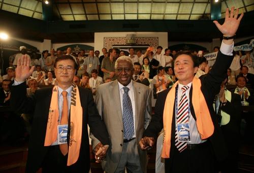대구가 2011년 제 13회 세계육상선수권대회 개최지로 선정된 27일 오후(한국시간) 케냐 몸바사 화이트샌즈 호텔에서 열린 국제육상경기연맹 집행이사회에서 김범일 대구시장(오른쪽)과 라민 디악 IAAF 회장(가운데)이 손을 잡고 환호하고 있다.ⓒ연합뉴스