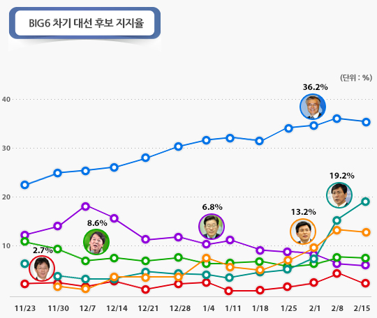 안희정 지사는 3.8%p 오른 19.2%로 2위 자리를 차지하며, 0.4%p 하락한 13.2%에 그친 황교안 대통령 권한대행과의 격차를 크게 벌였다. 안 지사는 한달새 약 15%p 가까이 수직급등했다.