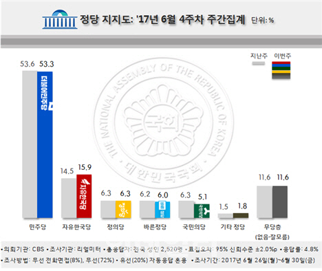 더불어민주당은 0.3%포인트 하락한 53.3%로 독주를 계속했고, 자유한국당은 1.4%포인트 오른 15.9%를 기록하며 8주 만에 15%대를 회복했고, 정의당(6.3%)과 바른정당(6.0%)은 6%대 초반의 지지율로 3위 자리를 두고 오차범위 내 접전 양상인 것으로 조사됐다.