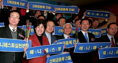 여야 의원들이 모여 매니페스토 실천 약속을 하고 있다. 매니페스토실천본부는 최근 여론조사의 객관성에 근원적 의문을 제기하고 나섰다. ⓒ연합뉴스