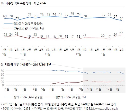 [한국갤럽] 文대통령 지지율 64%, 취임후 최저