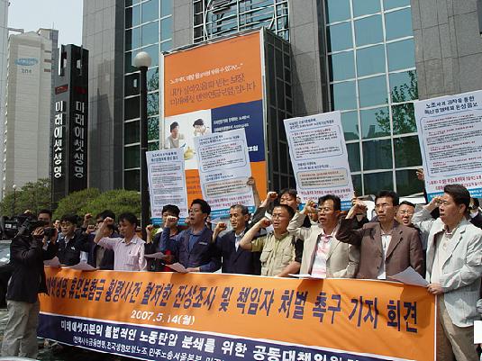 정용건 사무금융연맹 위원장은 이날 증권선물거래소에서 기자회견을 열고 "미래에셋운용의 부당한 수익률 관리는 투자자를 우롱하는 행위임에도 불구하고 금감원의 징계수위가 낮았다"며 "특별감사가 이뤄지지 않을 경우 미래에셋운용을 검찰에 고발하겠다"고 밝혔다. 정 위원장은 "미래에셋운용의 경우 현행법상 영업허가 취소와 임원해임 등의 중징계가 가능하다"고 주장했다.