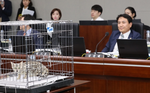 김 의원은 이날 정부세종청사에서 열린 정무위 국감에서 "지난 9월 18일 대전동물원에서 탈출했다가 사살된 퓨마와 비슷하게 생긴 동물을 가져왔다"며 "한번 보시라고 가져왔다”며 철조망 속에 갇힌 벵갈고양이를 국감장 위에 놓았다.