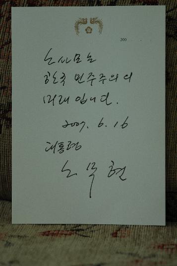 한편 노대통령은 이날 노사모 총회장에 "노사모는 한국 민주주의의 미래입니다"라는 친필 서한과 함께 소정의 선물들을 보내왔다고 노사모는 16일 오후 밝혔다.