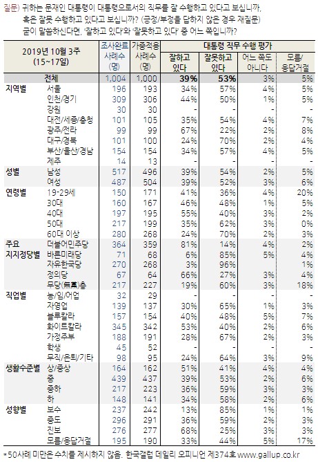 앞으로는, 5십만명 이하로 조사한 거는 올리지 마라 재수 없다. . 표를 쫙!~ 보니, “직무를 수행”이라는 대목이 짠~ 하다. 대체, 일반 국민이 통령의 직무수행을 감이나 잡고 있나? 이런 포괄적 질문은, 너 호랑이 목에 멍에를 씌울 수 있니? 라는 질문과 다를 게 없어 보인다. 당연히 답은 no.. , 아니면 아~~ 몰랑..
