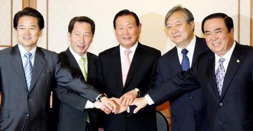 22일 오전 김원기 전 국회의장과 정대철 전 열린우리당 고문, 김근태, 정동영, 문희상 전 의장이 국회에서 오찬회동을 갖고 민주당에게 분당사태를 사과했다. ⓒ연합뉴스