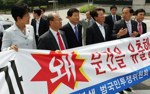 한나라당 공작정치 분쇄 범국민투쟁위원회(위원장 안상수 의원) 소속 의원들이 6일 오전 국가정보원을 항의 방문해 이명박 전 서울시장, 박근혜 전 대표와 관련된 의혹자료들의 유출 경위 등에 대한 진상규명을 요구하고 있다.ⓒ연합뉴스
