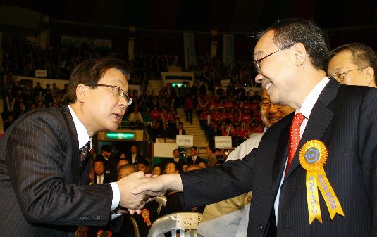 김진홍 뉴라이트전국연합대표가 강재섭 한나라당대표로부터 극진한 인사를 받고 있다. 박사모 등은 최근 김목사의 노골적 '이명박 올인'을 맹비난하고 있다. ⓒ연합뉴스