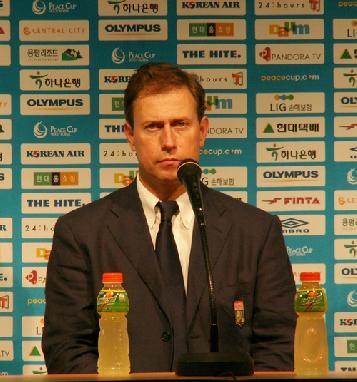 피스컵 우승직후 공식기자회견에 임하는 올림피크 리옹의 알렌 페렝 감독 ⓒ뷰스앤뉴스