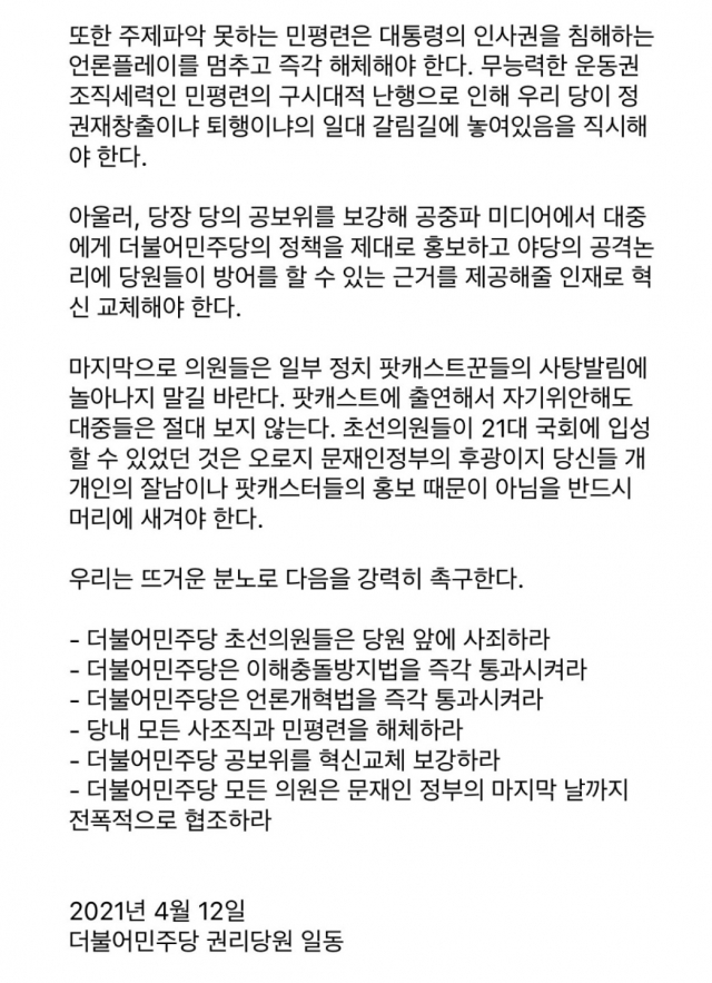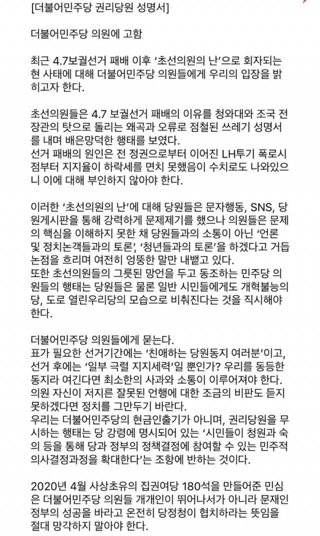 '더불어민주당 권리당원 일동'은 12일 '권리당원 성명서'를 통해 "초선의원들은 4·7보궐선거 패배의 이유를 청와대와 조국 전 장관의 탓으로 돌리는 왜곡과 오류로 점철된 ‘쓰레기 성명서’를 내며 배은망덕한 행태를 보였다”고 초선들을 원색비난하면서 “선거 패배의 원인은 전 정권으로부터 이어진 LH투기 폭로 시점부터 지지율이 하락세를 면치 못했음이 수치로도 나왔으니 이에 대해 부인하지 않아야 한다”고 강변했다.