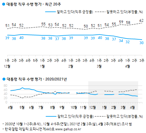 <한국갤럽> 조사결과, 문재인 대통령 지지율이 4.7 재보선 참패후 '레임덕' 바로미터인 30%까지 추락하락한 것으로 나타났다. 특히 문 대통령 지지율은 취임후 처음으로 더불어민주당 지지율 31%보다 낮아져, 당 장악력이 급속 약화될 위기에 처했다.