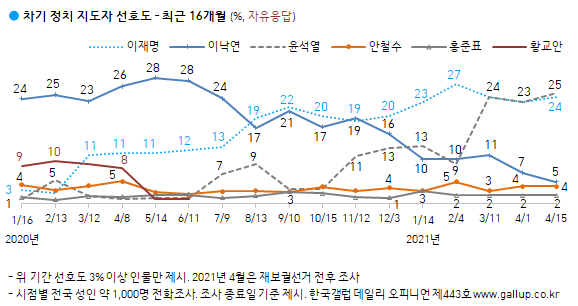 이재명 경기도지사는 1%포인트 오른 24%로 2위였다.