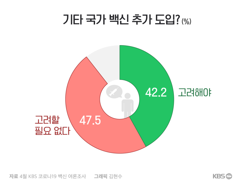 백신 수급 불안에 따라 러시아-중국 백신을 도입해야 할지에 대해선 42.2%가 중국·러시아 등 '기타 국가'가 개발한 백신도 도입을 고려해야 한다고 답했고, 백신 추가도입은 필요없다는 47.5%로 오차범위 내에서 팽팽했다.