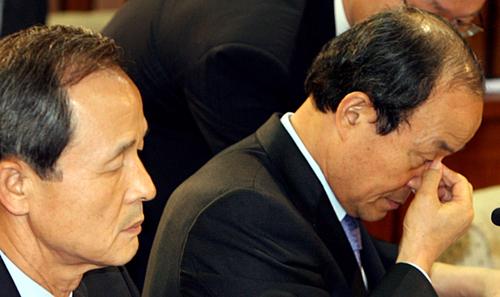 송민순 외교장관이 25일 피로감에 눈가를 만지고 있다. 역시 심각한 표정의 김장수 국방장관. ⓒ연합뉴스