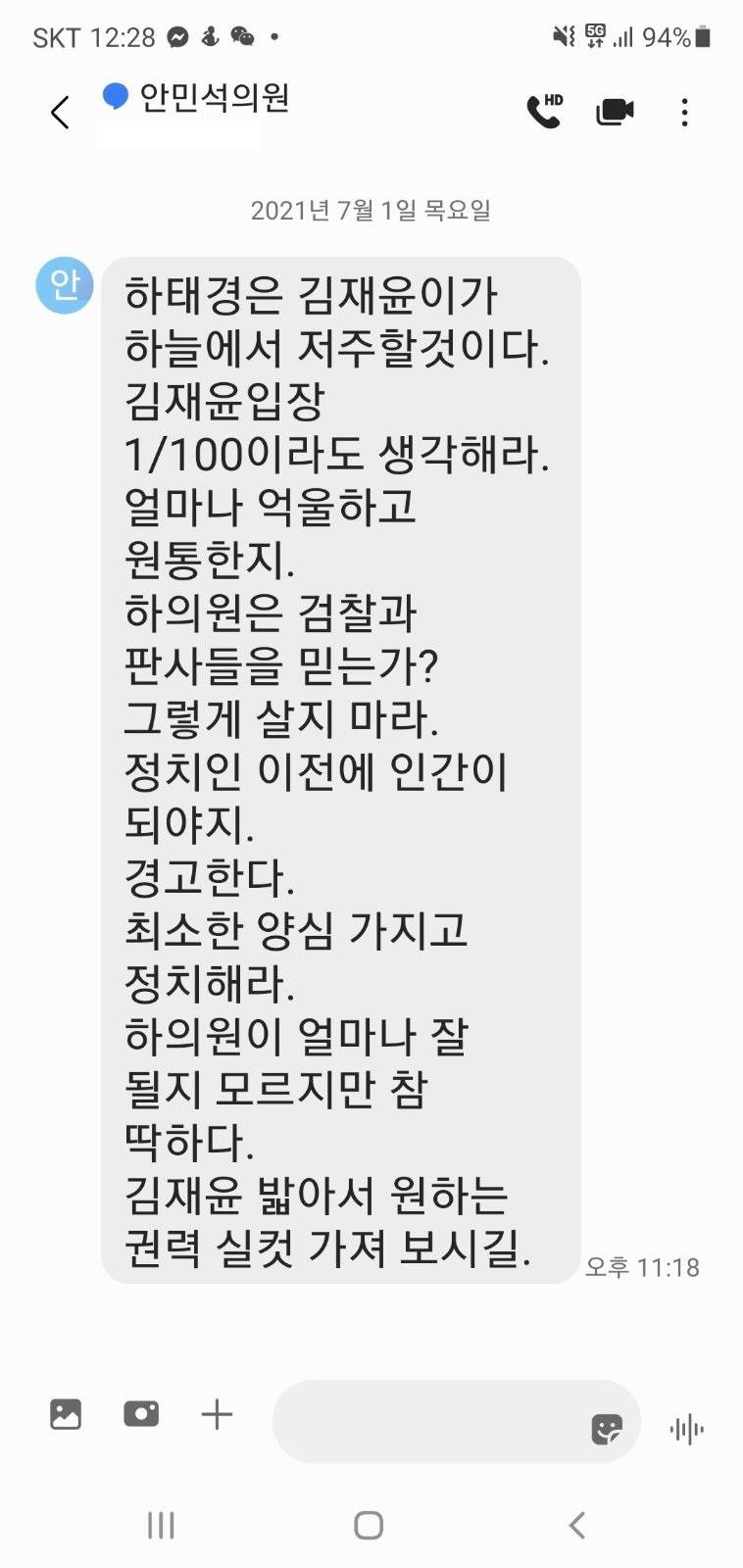 이어 "더구나 제가 협박문자에 대한 사과 요구하자 재차 인격모독성 답장을 보냈다"며 "사과를 거부한 이상 이런 분이 계속 국회의원을 해도 좋은지, 국회 윤리위원회에 제소해 판단을 구하겠다"며 윤리위 제소 방침을 밝혔다.