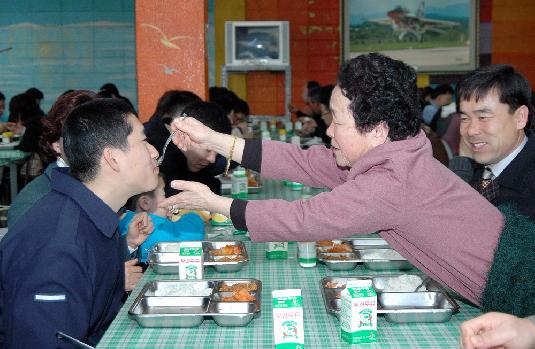 공군의 한 훈련비행단의 신병부모 초청행사에 참가한 한 부모가 신병인 아들에게 밥을 떠 먹여주고 있다. 이처럼 귀한 아들들이 최근 잇따라 자살하고 고문을 당해 부모들을 분노케 하고 있다. ⓒ연합뉴스