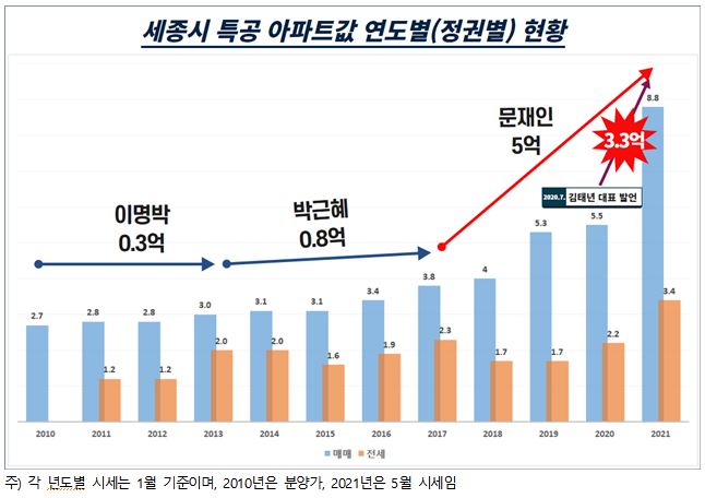 국민은행 통계 기준 세종시 아파트값은 문재인정부 이후 116%, 한 채당 3억이 올랐고, 2020년 이후에만 무려 2억7천만윈이 올랐다.