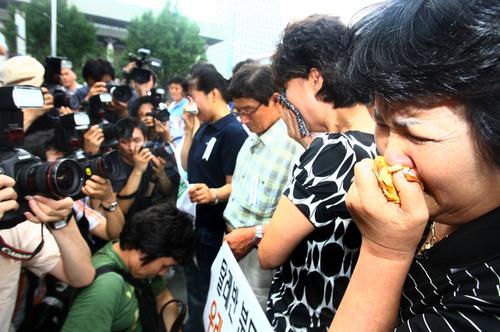 아프간 무장세력에 납치된 한국인 피랍자 가족들이 1일 오후 광화문 미대사관을 방문, 사태 해결을 위한 미국 정부의 협조를 요청한 뒤 기자회견을 하며 눈물을 흘리고 있다. ⓒ연합뉴스