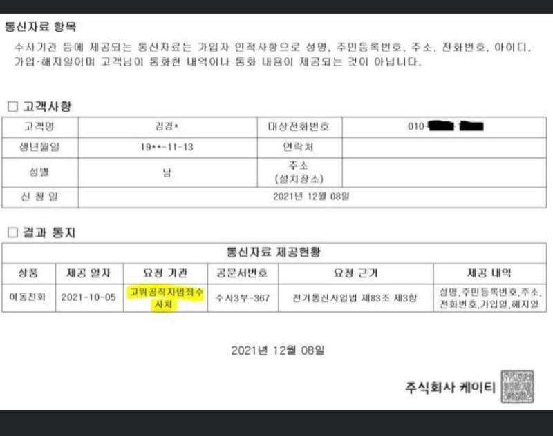 <전기통신사업법 제83조 제3항에 따르면 전기통신사업자는 재판, 수사, 형의 집행 또는 국가안전보장에 대한 위해를 방지하기 위한 정보 수집을 위해 검사 등이 통신자료의 열람이나 제출을 요청하면 그 요청에 따를 수 있다.>-지덜이 떡하니 근거까정 올려 노코 먼 소린지.. 수사 대상자와 겡률이가 연관이 있었나보g~