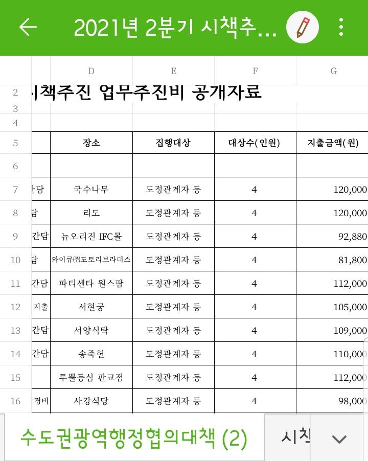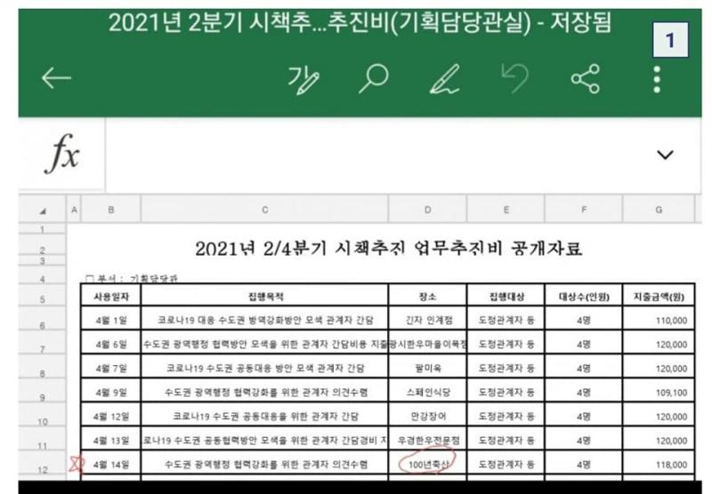 박 보좌역은 또다른 자료를 통해선 도정 관계자 4명이 '국수나무'라는 프렌차이즈 국수가게에서 12만원을 사용한 대목을 문제 삼았다.
