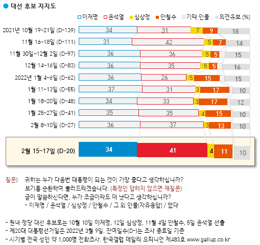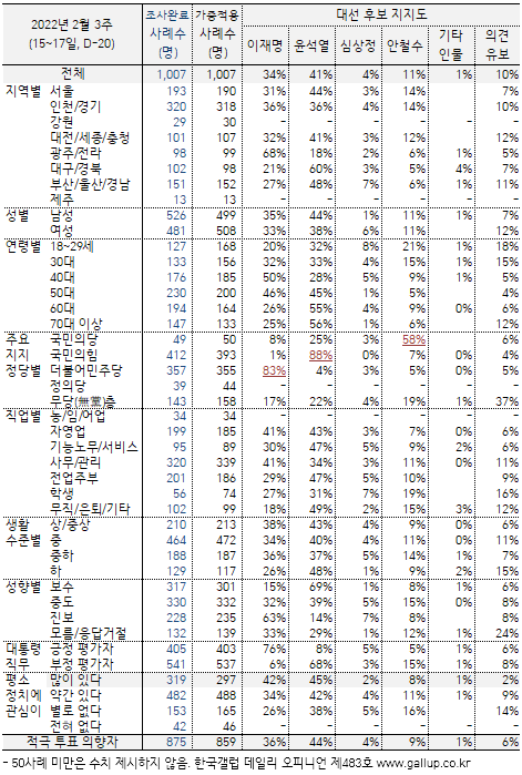 여론조사질문 중간에 응답을 끊거나 응답거부하는경우는 여론에 반영이 안되는데- 이재명후보쪽 유권자는 여론조사에서 후보단일화같은 질문에 끝까지 응답안하는 경향이있고 보수쪽은 묻지마 응답하므로 윤후보가 높게나오는 착시가 생기는데 과거 이회창-노무현 대선후보때도 이회창이 선거기간동안 대세1위 였다가 결과는 노무현대통령이된것이 이런경우다