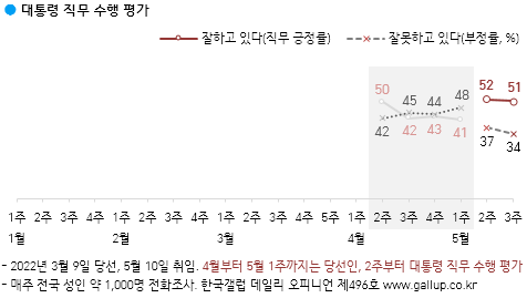 5월 둘째주 긍정평가와 부정평가는 52% 대 37%로 나타났다. 세째주에는 51% 대 34%로 나타났다.