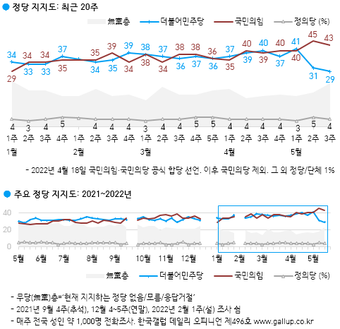 <한국갤럽> 조사결과를 보면 윤 대통령의 5월 첫째주 긍정평가와 부정평가는 41% 대 48%였다. 당시는 정호영 보건복지부장관 후보, 김인철 교육부장관 후보 등 윤 대통령의 각료 인선이 여론의 호된 비판을 받고 있던 시기였다.