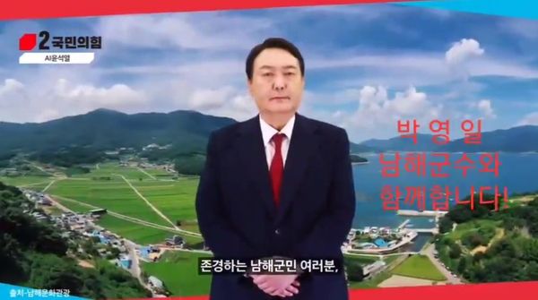 박지현 위원장은 이날 페이스북을 통해 이같이 말하며 "남해군에서 박영일 국민의힘 후보가 돌린 동영상이다. 실제 윤석열 대통령이 남해군수 지지연설을 하는 것처럼 되어 있다"고 지적했다.