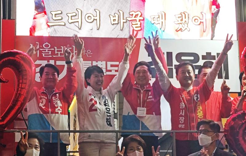김 후보는 "3월 9일 정권교체를 이루어냈다. 저는 그때 봄이 온지 알았지만, 그게 진정한 봄이 아니었다"며 "자신들의 치부를 검수완박으로 가리고 '70살이 뭘 배우려 하냐'고 갈라치기를 하며 지방선거를 분열과 갈등의 지긋지긋한 퇴행적 과거로 몰아넣었다"며 민주당을 질타했다.
